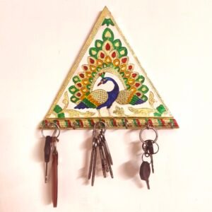 Apart from organizing the keys, this handmade aesthetically designed Golden Meenakari key holder with 6 key hooks is a perfect addition to introducing our Dharohar Beautiful Meenakari Rajasthani Work Key Holder – a stunning piece of artistry that seamlessly combines functionality with exquisite design. This Peacock Triangular Key Holder is a true testament to the rich cultural heritage of Rajasthan. Carefully handcrafted and hand-painted, it’s not just a key holder but a statement piece for your home decor. With six sturdy hooks, it provides ample space to keep your keys organized and easily accessible. Its big size ensures that it stands out as a captivating focal point on your wall. Elevate your home decor with this unique piece, and let the intricate Meenakari work and the vibrant colors of Rajasthan breathe life into your living space. This key holder is not just a practical addition but also a work of art that reflects the beauty of Indian craftsmanship. office or home’s wall décor. This useful artifact is a preferred gift for any occasion.