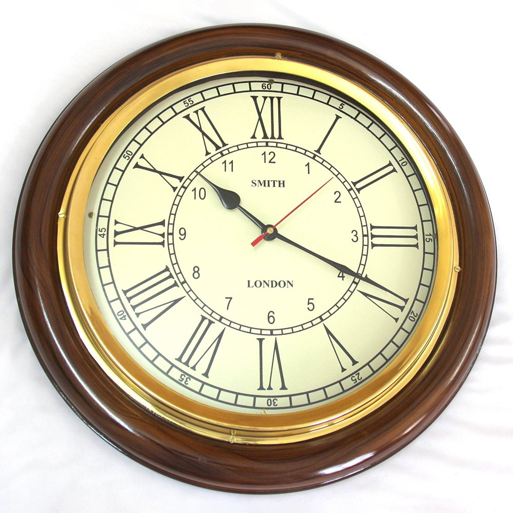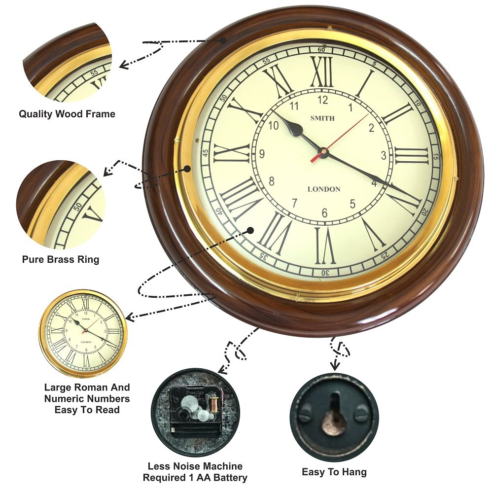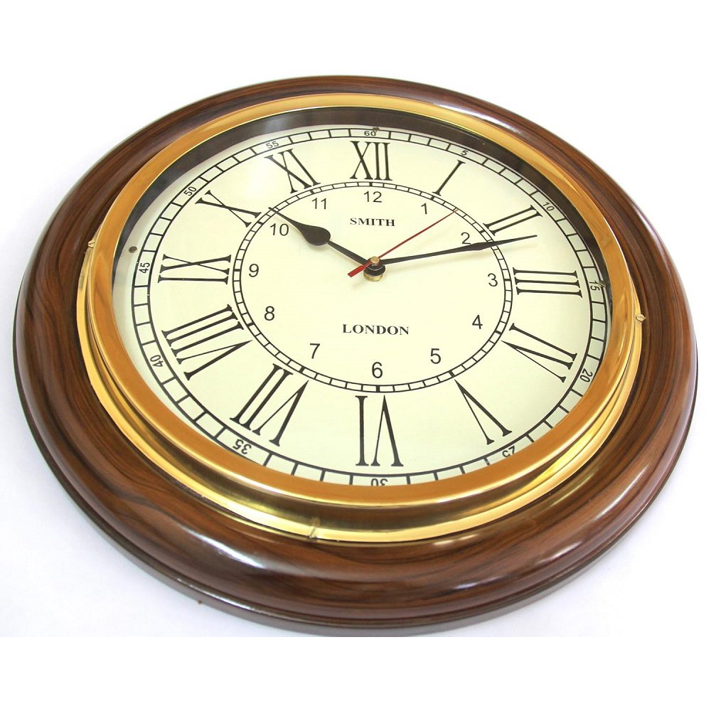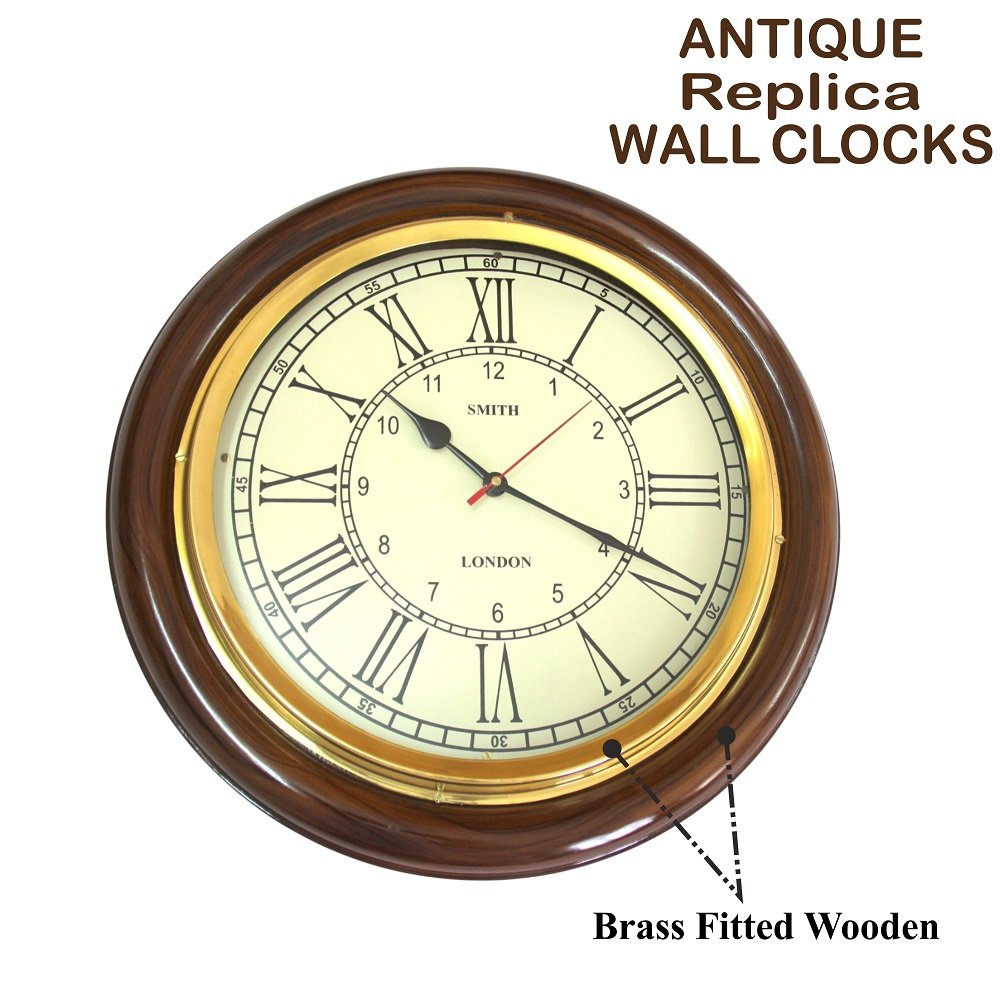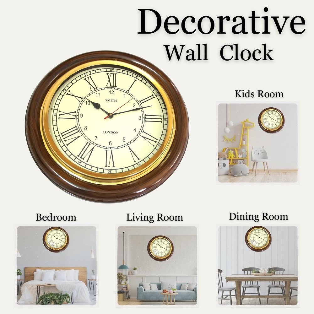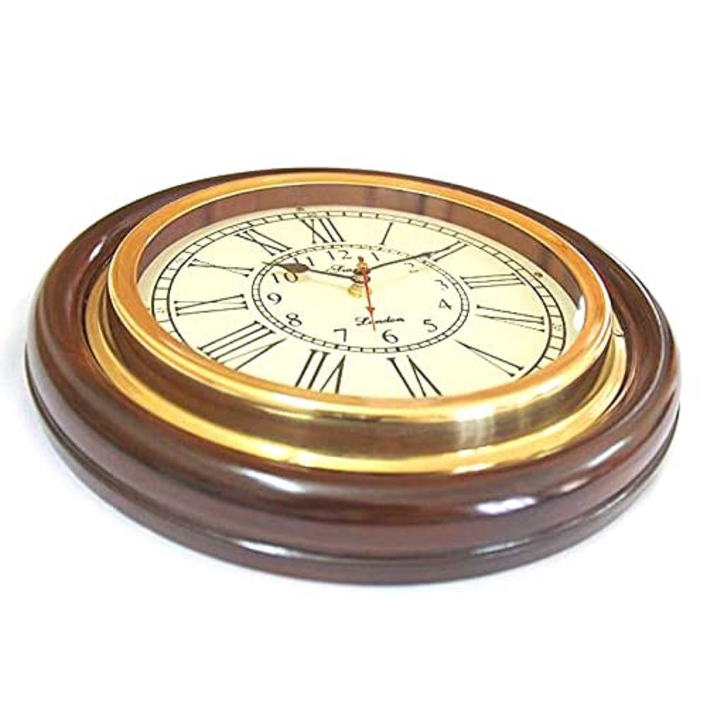 12 Inch Wooden Brass Analog Wall Clock for Home, Living Rooms, Hotels, Restaurants & Office