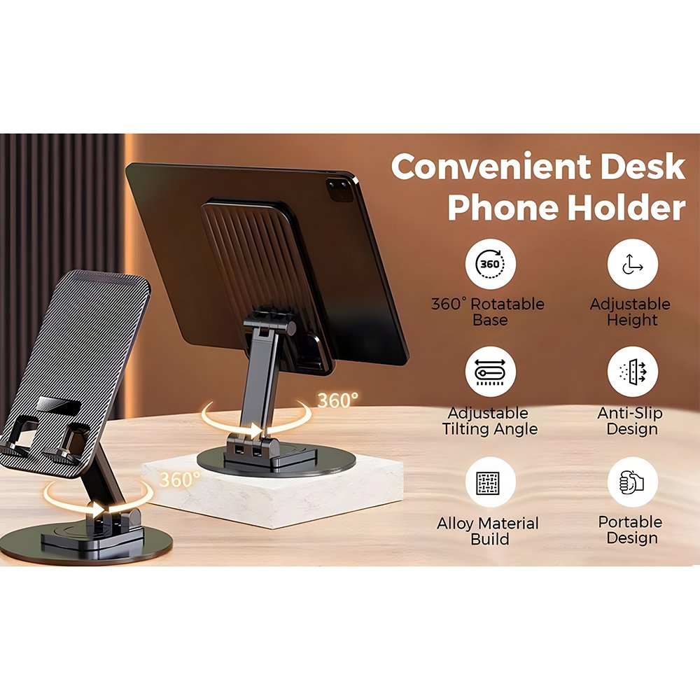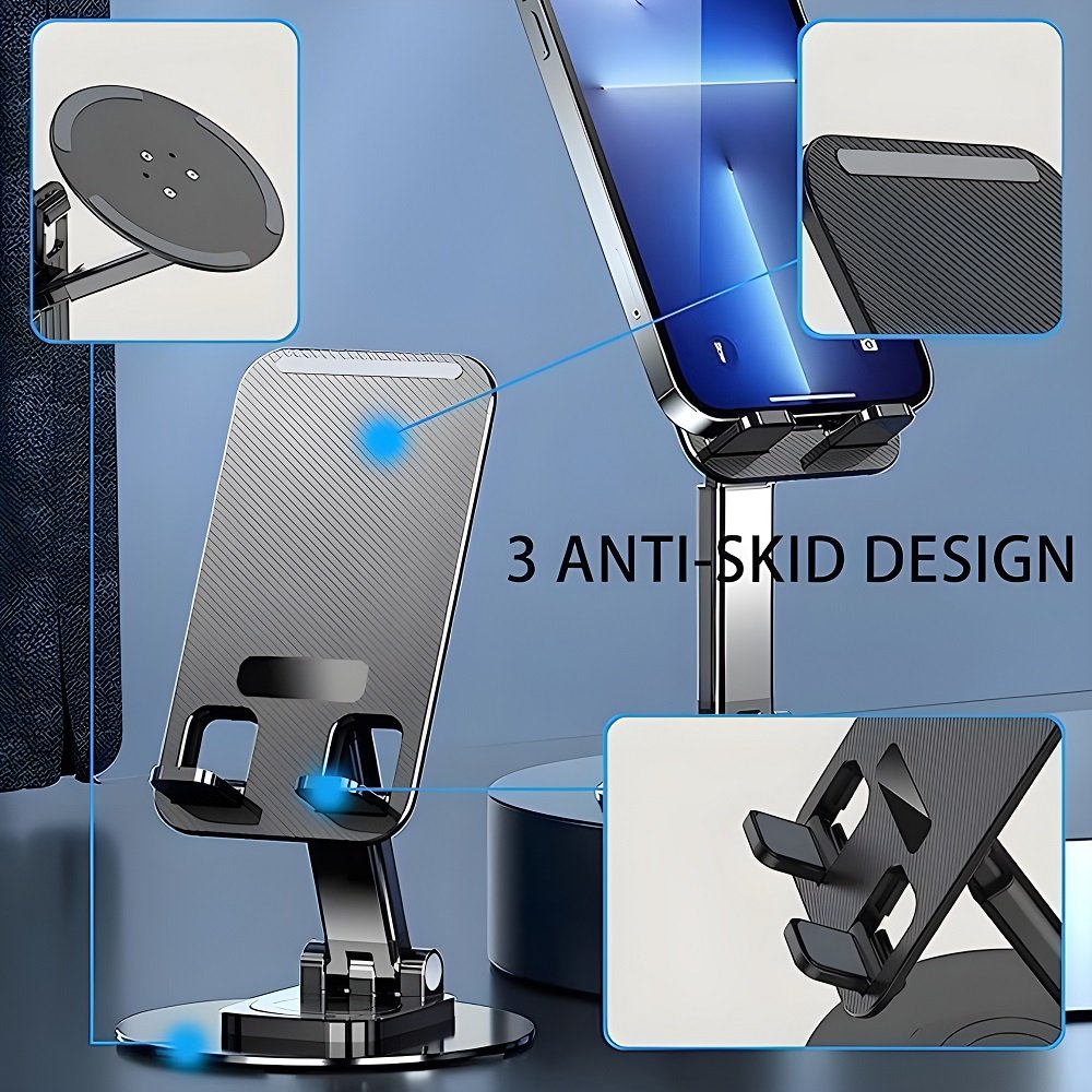 Cell Phone Stand, 360°Rotation Height Adjustable Phone Holder for Desk, Thick Case Friendly Foldable Portable Cellphone Stand Compatible with All Mobile Phone