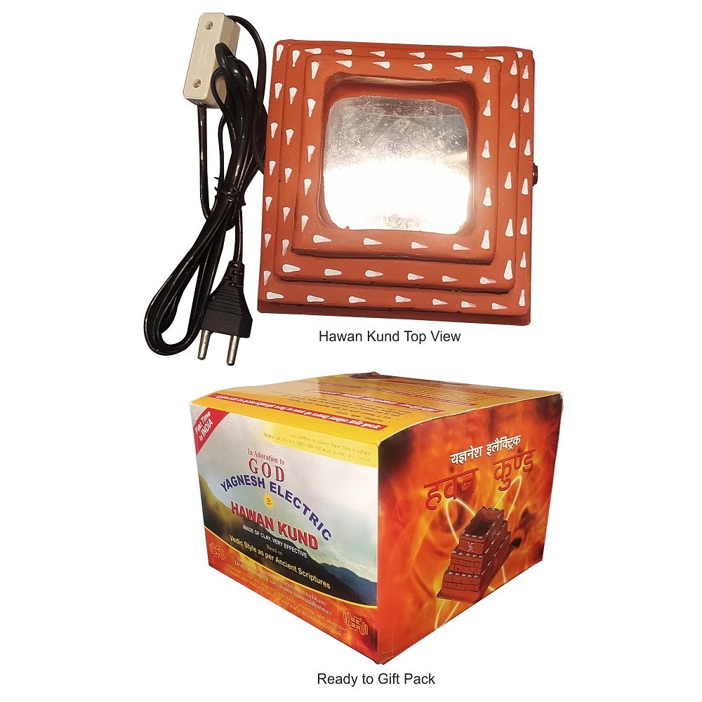 This first of its kind Yagnesh Electric HawanKund is a Registered product under Handloom and Handicraft Development Corporation. Provide protection against Navgraha, Nakshatra, Vaastu & Nazar Dosha. It is user friendly and perfect for Personal, Festive & Corporate Gifting. PACK INCLUDES: Havankund+ Sample pouch of VishishtYagneshHavanSamagri+ 32 pages of bi-lingual booklet explaining the astrological, wordly, spiritual & medicinal benefits + 16 pages bi-lingual instructional manual containing (Frequently Asked Questions) Benefits: Age old proven Finest Source of Positive Energy Protection against Navgraha, Nakshatra, Vaastu&NazarDosha Enriches our Personal as well as Professional (office/Business/shop) Life usage of Camphor, Guggal& Daily DHUNA (commonly used to counter Negative Energy/Evil Effects/ NazarDosha) way to invoke the blessings of Almighty. Peace, Prosperity & The Power Of Positive Thinking Fragrant, no Pollution& no grem Surrounding Proved Medicinal, Astrological, Worldly & Spiritual benefits perfect for Personal, Festive & Corporate Gifting User Friendly/ no Maintenance / No Excessive Fumes Features: It is made up of clay (terracotta) in Vedic style, as per ancient Indian scriptures. Power/Electricity consumption 65W only, that too for few minutes only. Easy to use size (6″ x 6″ x 5″ (inch)), it can be placed anywhere (home, office, shop, factory. ), No Excessive Fumes Weight – 1300gm Approx How to use: Simply plug in the apparatus (HawanKund) and wait for 3-5 minutes and the HawanKund is ready to use.
