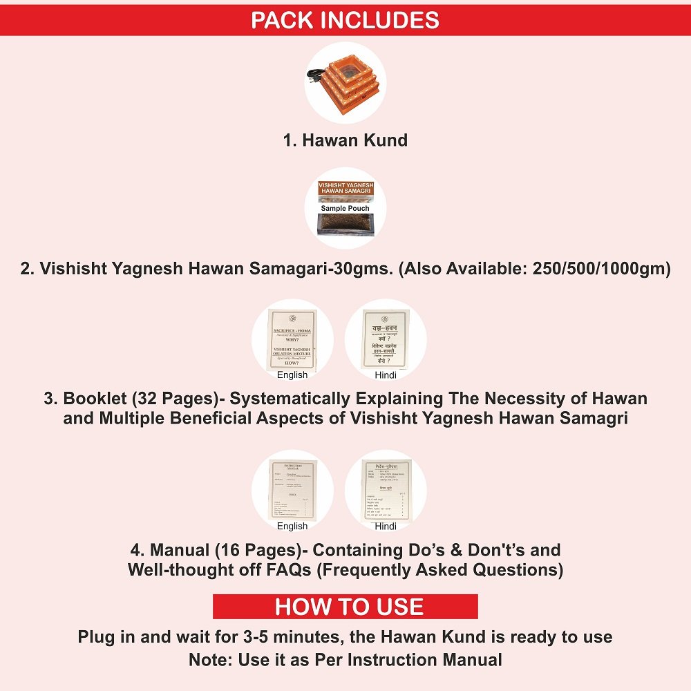 Pack Includes: Hawan Kund + Hawan Samagri + 32 Pages of Bi-Lingual Booklet Explaining the Astrological, Spiritual, Personal, Professional & Medicinal Benefits + 16 Pages Bi-Lingual Instructional Manual Containing do’s/dont’s & FAQ (frequently asked questions).