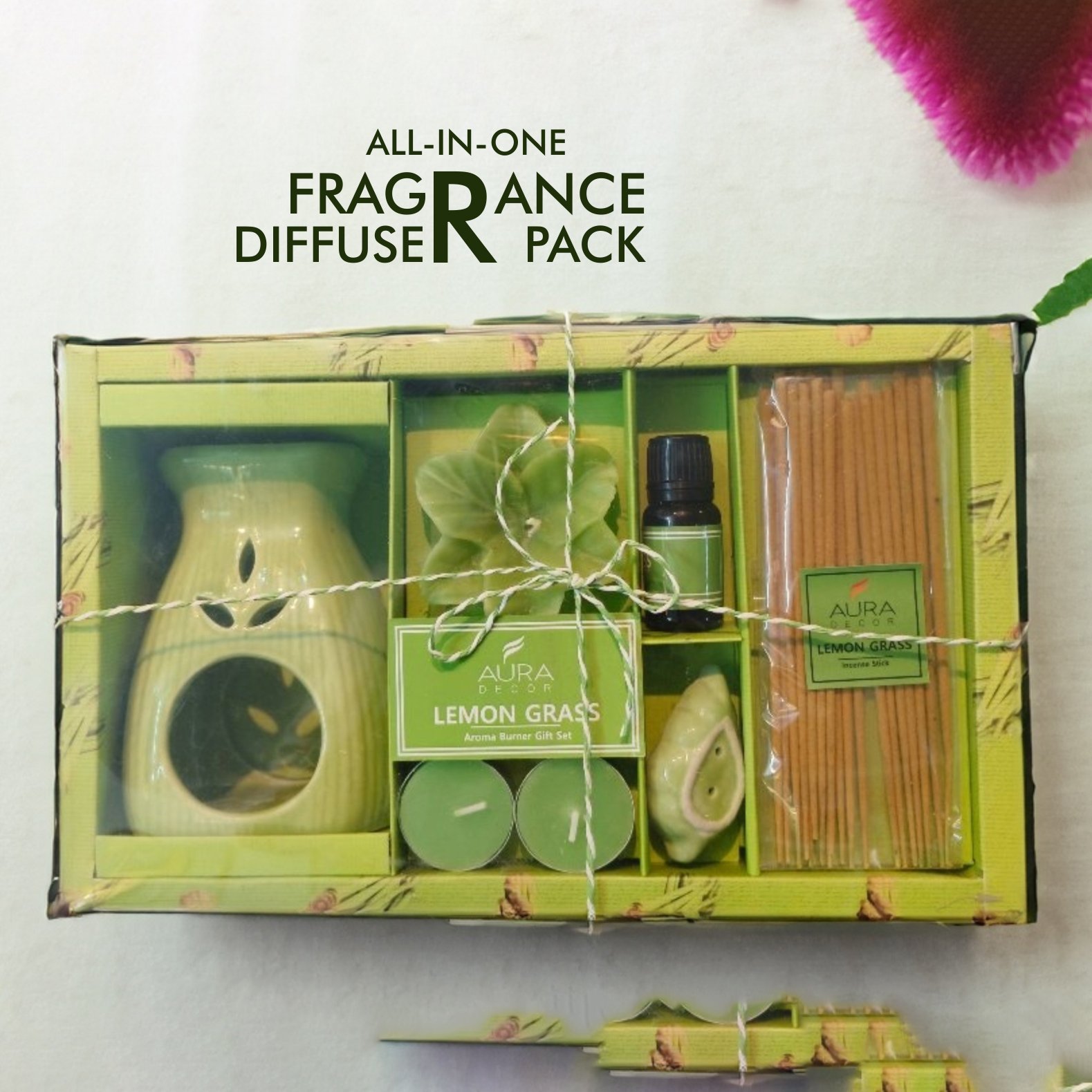 Fragrance combo Pack Contents: 1 Ceramic Diffuser, 2 tealight Candles, 10 ml Aroma/Fragrance Oil, 1 Fragrance Floting Candle, 1 Incense Stick Holder, Incense Sticks