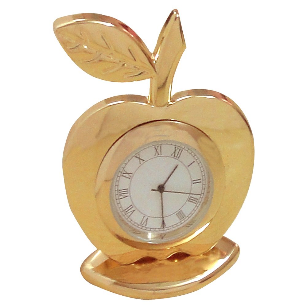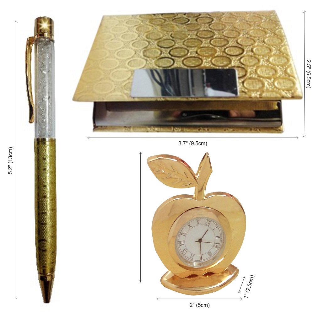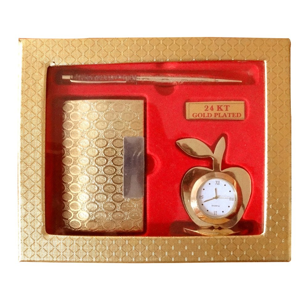 Gold Plated Pen and Visiting Card Holder with Apple Shape Clock and Key Ring (Golden)