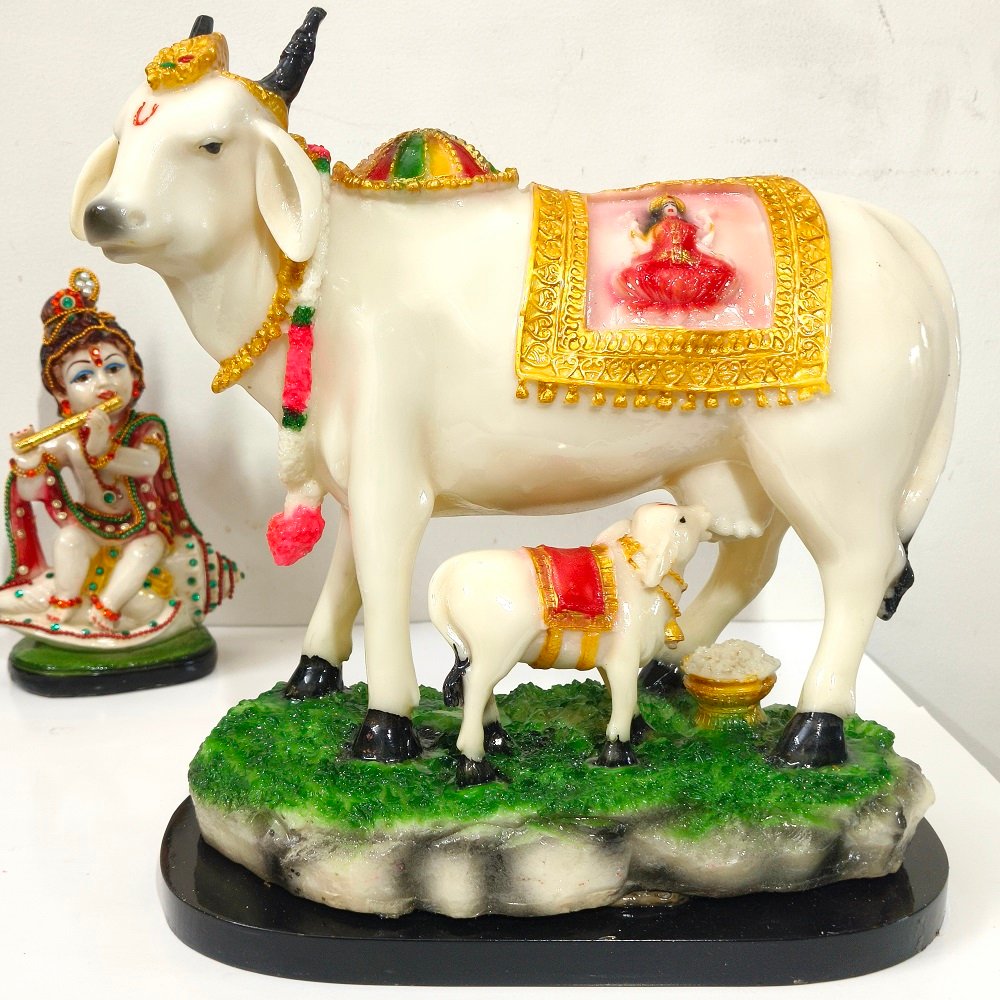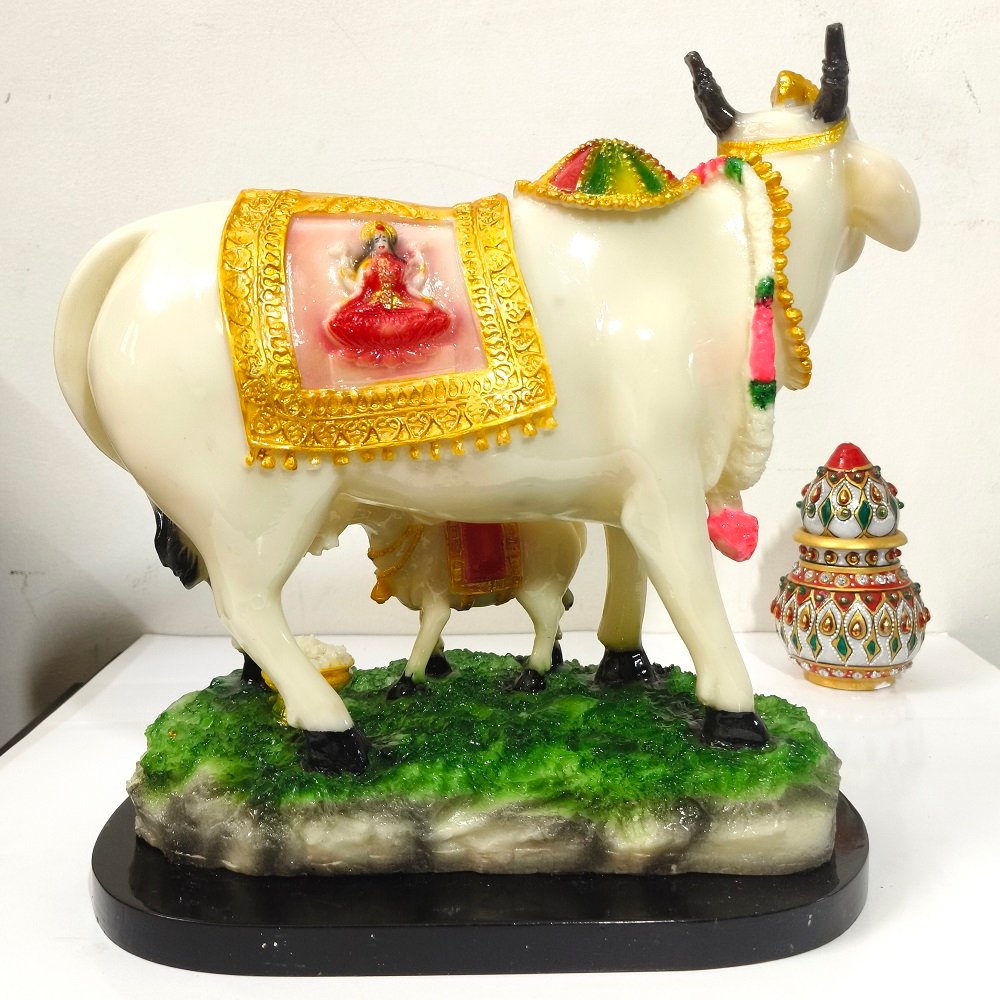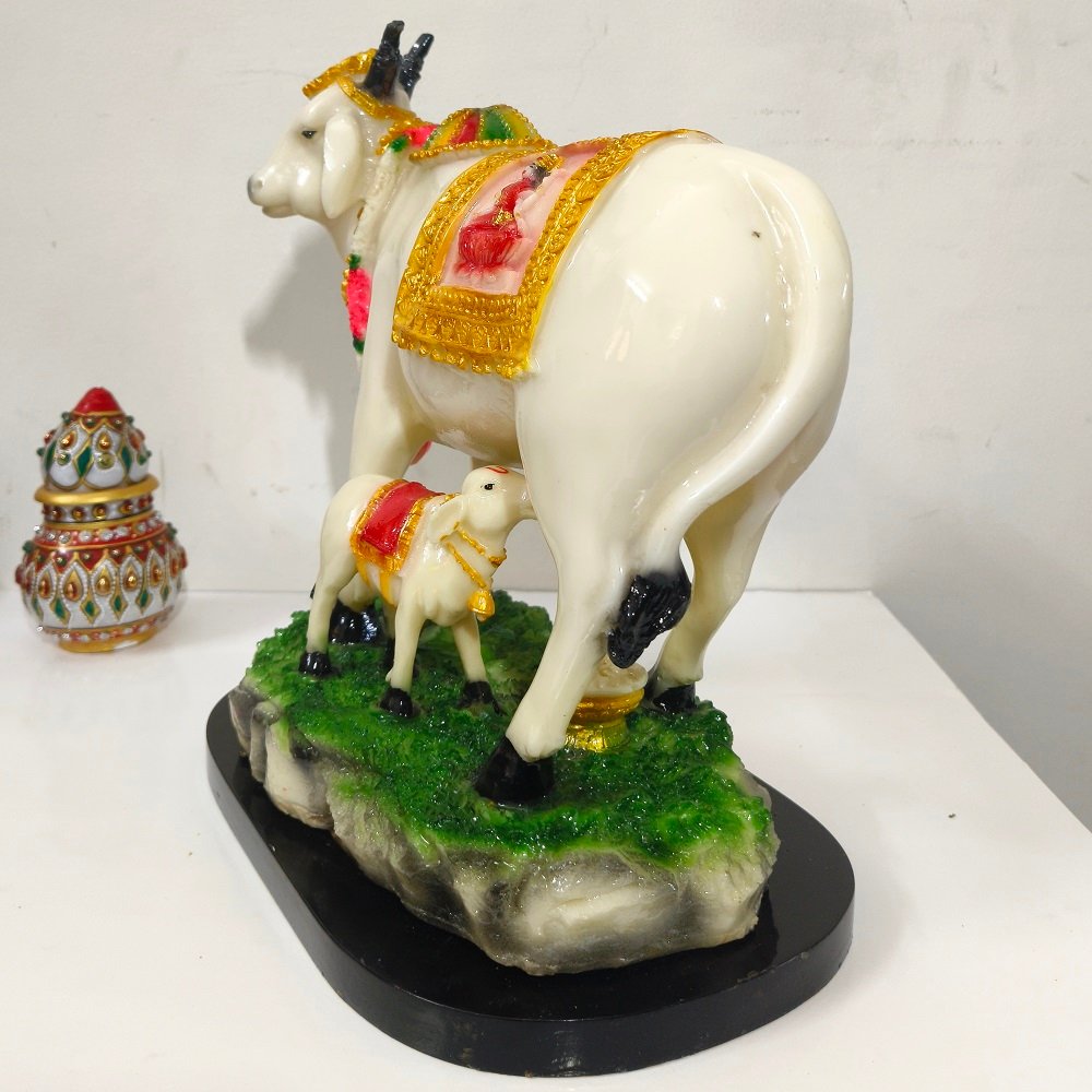 This Religious Cow Statue along with its calf is symbol of prosperity and Vatsalya (love of mother for a child) Polyresin holy good luck cow with calf.
