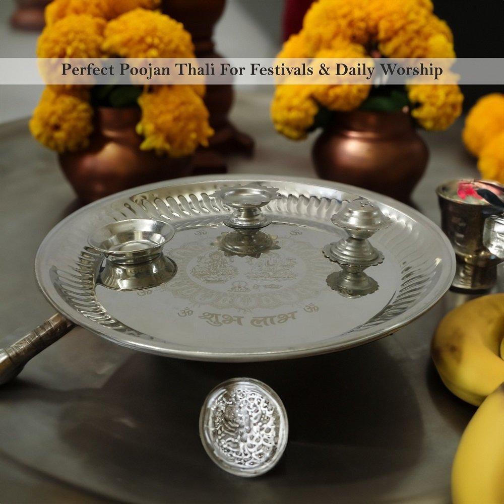 Dharohar: The Heritage presents an exquisite and elegant Stainless Steel Pooja Thali, perfect for celebrating various traditional Indian festivals and ceremonies. This beautifully crafted thali features intricate designs and detailing, making it an ideal choice for auspicious occasions like Diwali Pooja, Laxmi Ganesh Pooja, Bhai Dooj Tika, Raksha Bandhan, and other festive rituals. Made from high-quality stainless steel, this thali not only exudes charm but also ensures durability and longevity. The intricate artwork and decorative elements on the thali reflect the rich cultural heritage of India, adding a touch of tradition and grace to your celebrations. The Dharohar Stainless Steel Pooja Thali is designed to enhance the ambiance of your worship space. Its versatile use makes it suitable for various rituals, including Aarti ceremonies, making it an indispensable part of your religious practices. The thali’s ergonomic design allows for easy handling and ensures a comfortable grip while performing religious rituals. Elevate your festive celebrations with this Designer Pooja Thali, which is not just a functional accessory but also a symbol of tradition and spirituality. Its timeless appeal and meticulous craftsmanship make it a cherished addition to your festive rituals, adding a sense of devotion and reverence to your worship ceremonies. Bring home the Dharohar Stainless Steel Pooja Thali and immerse yourself in the divine aura of traditional Indian festivities, making your rituals more meaningful and memorable.