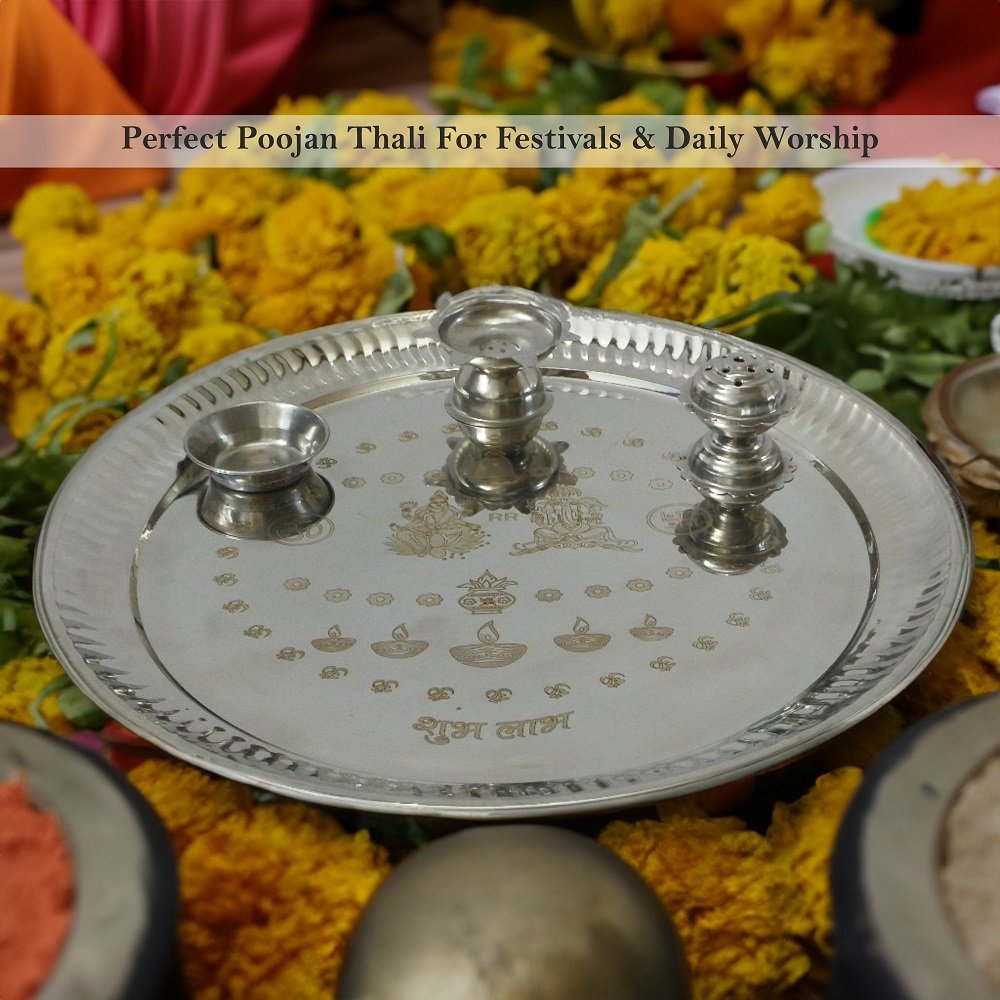 Dharohar: The Heritage presents an exquisite and elegant Stainless Steel Pooja Thali, perfect for celebrating various traditional Indian festivals and ceremonies. This beautifully crafted thali features intricate designs and detailing, making it an ideal choice for auspicious occasions like Diwali Pooja, Laxmi Ganesh Pooja, Bhai Dooj Tika, Raksha Bandhan, and other festive rituals. Made from high-quality stainless steel, this thali not only exudes charm but also ensures durability and longevity. The intricate artwork and decorative elements on the thali reflect the rich cultural heritage of India, adding a touch of tradition and grace to your celebrations. The Dharohar Stainless Steel Pooja Thali is designed to enhance the ambiance of your worship space. Its versatile use makes it suitable for various rituals, including Aarti ceremonies, making it an indispensable part of your religious practices. The thali’s ergonomic design allows for easy handling and ensures a comfortable grip while performing religious rituals. Elevate your festive celebrations with this Designer Pooja Thali, which is not just a functional accessory but also a symbol of tradition and spirituality. Its timeless appeal and meticulous craftsmanship make it a cherished addition to your festive rituals, adding a sense of devotion and reverence to your worship ceremonies. Bring home the Dharohar Stainless Steel Pooja Thali and immerse yourself in the divine aura of traditional Indian festivities, making your rituals more meaningful and memorable.