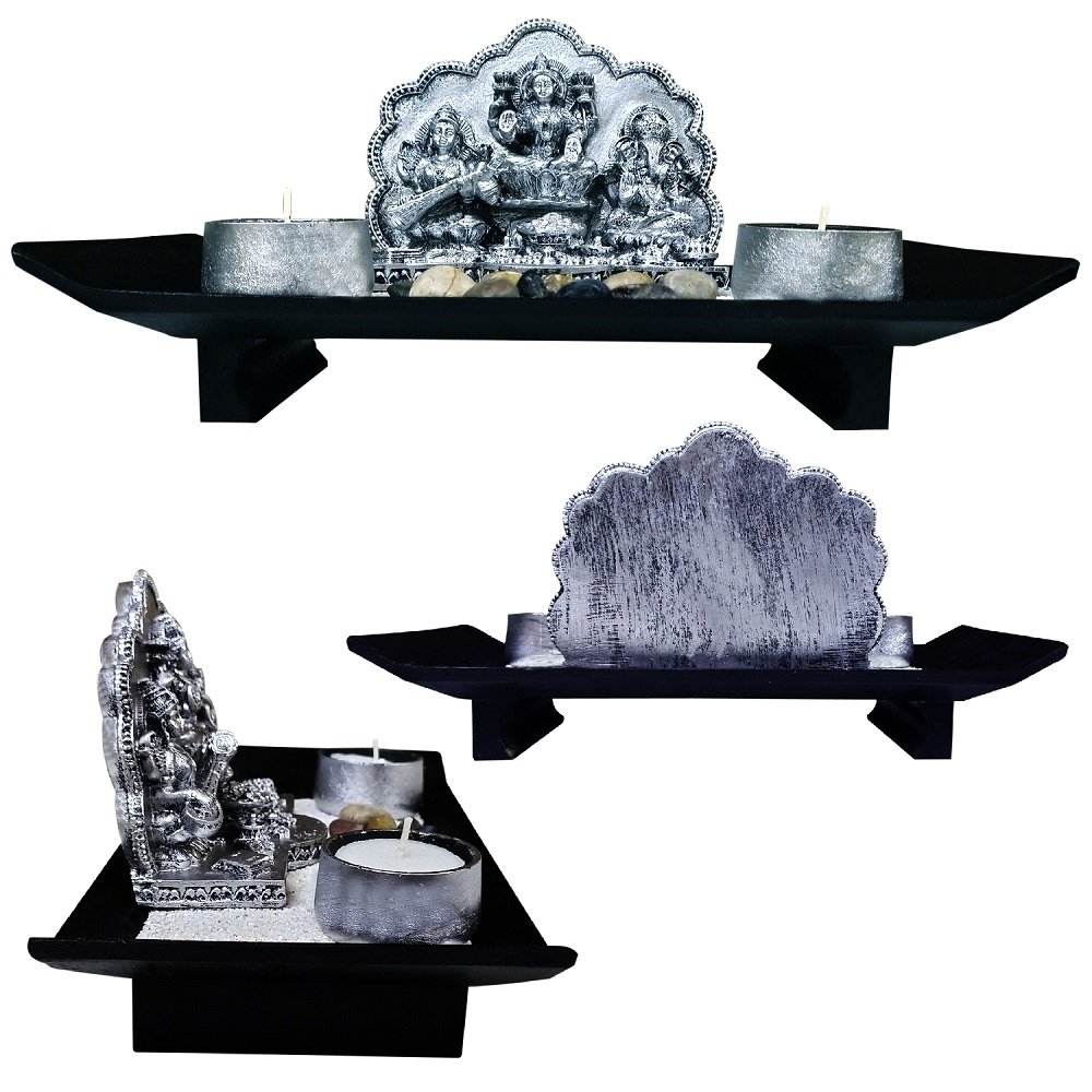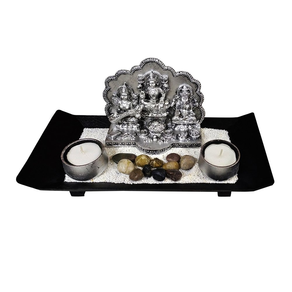Introducing the Silver tone Lakshmi Ganesha Saraswati, a divine masterpiece meticulously crafted from polyresin, blending marble powder with resin, and elegantly carved to perfection. This exquisite trio is gracefully showcased on a captivating black wooden tray, adding a touch of sophistication to any space. Beneath the divine figures lies a sheet of fine white marble granules, enhancing the statues’ divine aura and elevating their overall aesthetic appeal. The arrangement is further adorned with edgeless river bed stones, carefully chosen for their diverse shades and sizes, creating a harmonious and visually appealing composition. Flanking the statues on both sides are elegantly crafted silver-tone tea light candles, casting a soft, warm glow that enhances the divine ambiance. This ensemble not only serves as a unique and captivating décor item for your home or office but also makes for a thoughtful and meaningful gift for your loved ones, as well as your esteemed business and corporate associates and clients. Embrace the essence of spirituality and elegance with this remarkable creation, a symbol of divine blessings and artistic brilliance, designed to add a touch of grace and charm to any environment.