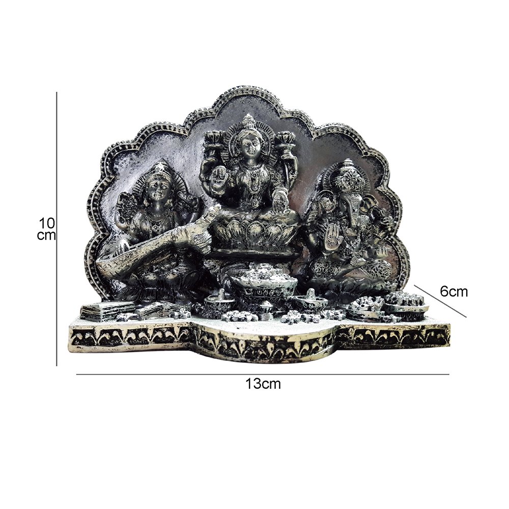 Handcrafted from high-quality polyresin, combining marble powder and resin, the Silver tone Lakshmi Ganesha Saraswati statues exude elegance and divine charm.