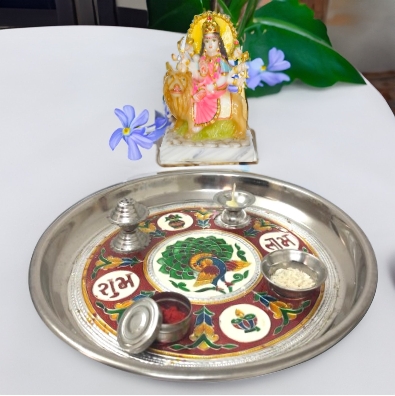 • Contains: Puja Plate, Chawal bowl, Incense Stick, Roli box, Jyot