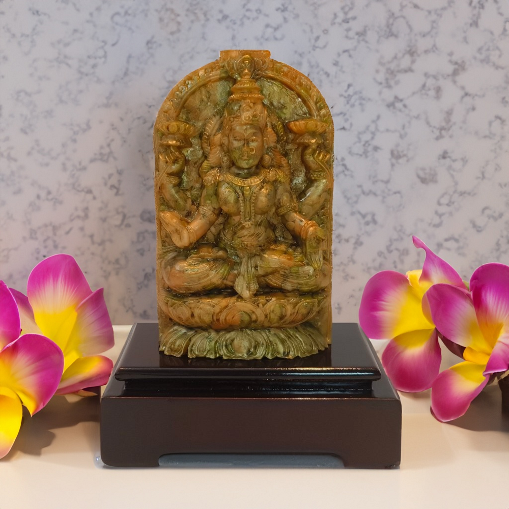Traditionally it is believed that having a four-handed Lakshmi statue in homes or places of worship brings the blessings of the goddess and ensures financial stability and protection from financial hardships. It symbolizes the omnipresence and all-encompassing nature of Goddess Lakshmi’s blessings to attract wealth and prosperity into the home or business.