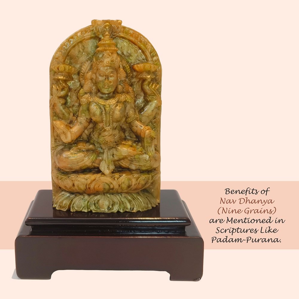 Is it not amazing that this Chaturbhuj Mahalakshmi statue is made from Navdhanya, the nine sacred grains? Those grains whose multi-beneficial significance has been mentioned in Padma-Purana also. Being made of Navdhanya, the nine auspicious grains, the importance and impact of this fortune giver Chaturbhuja Mahalaxmi statue increase multi-fold.