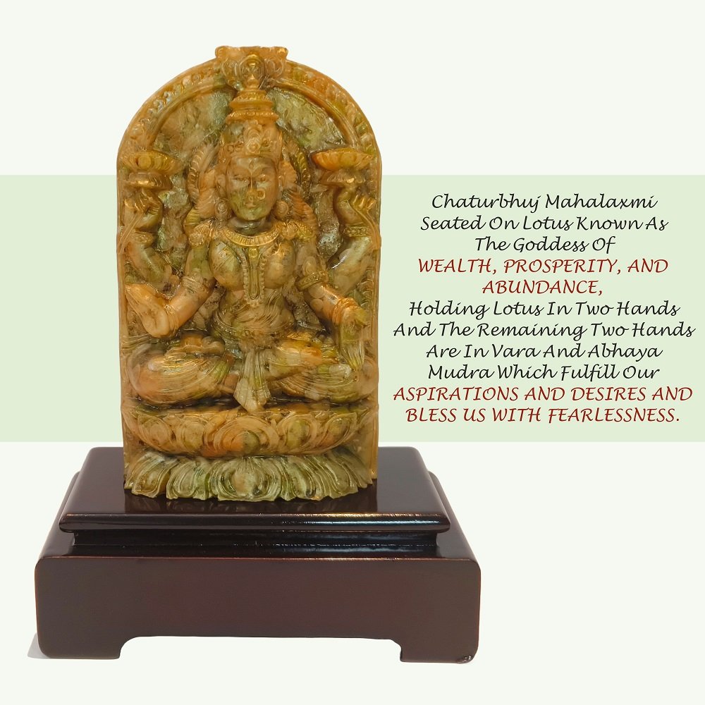 Chaturbhuj Mahalaxmi is seated on A grand Lotus known as the Goddess of wealth, prosperity, and abundance, holding a lotus in two hands symbolizing purity and the pursuit of dharma (righteousness), another hand in Abhay mudra, a gesture that signifies protection and liberation from the cycle of birth and death (samsara), and the fourth hand in Var mudra, represents the fulfillment of desires and aspirations of the devotees.