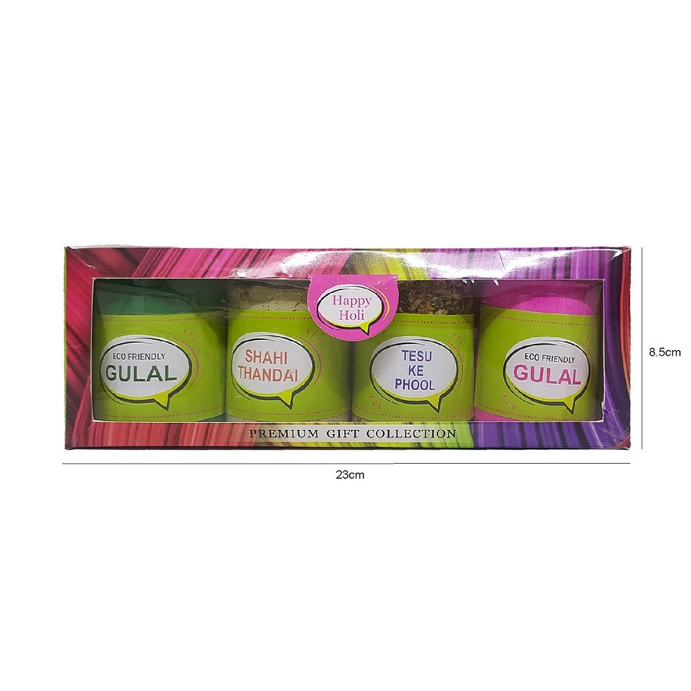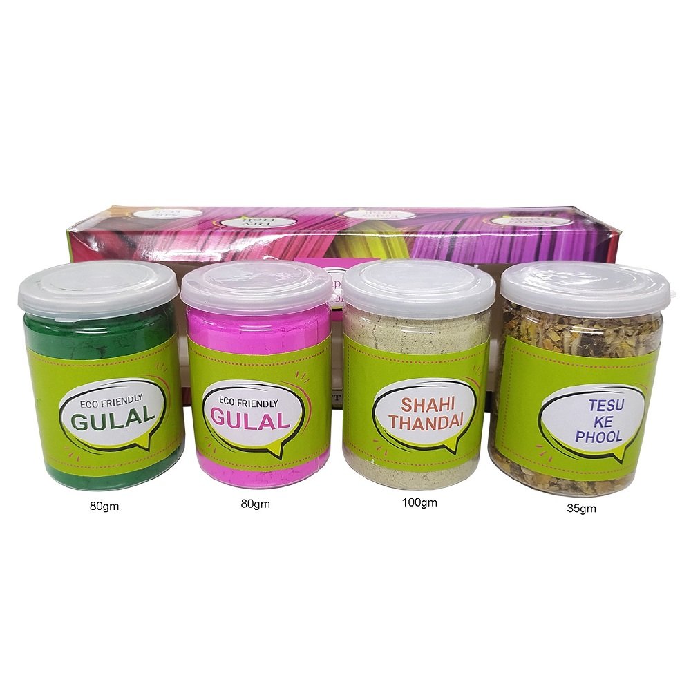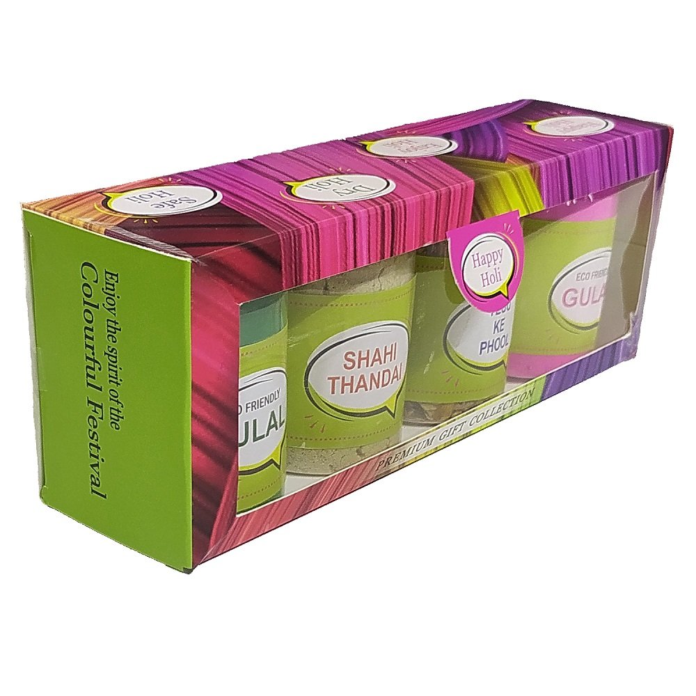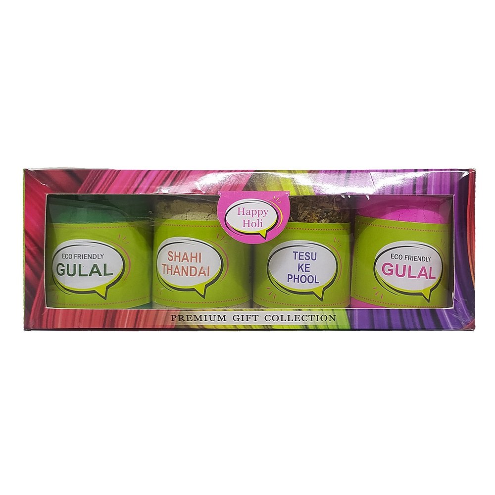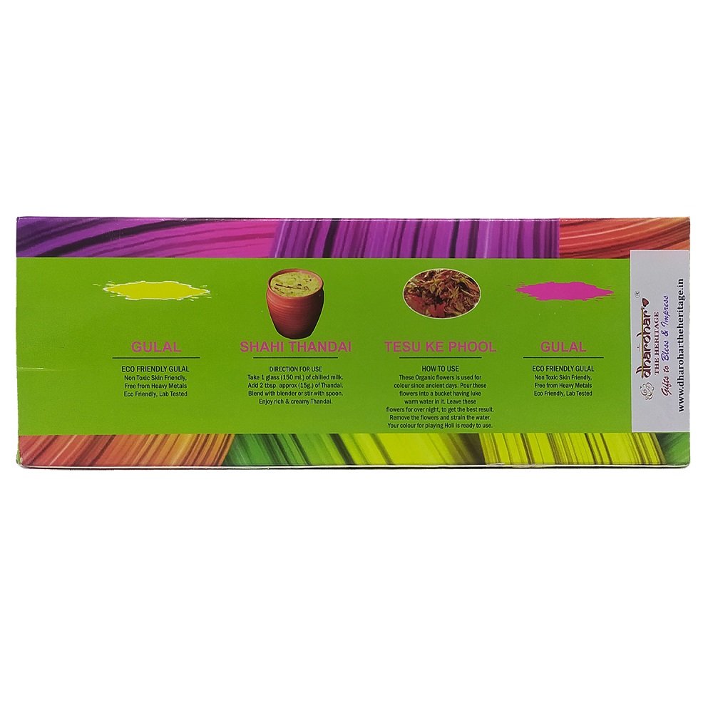 READY TO GIFT- As it comes to you in a beautiful Gift Box. Green & Pink Gulal holi colors – The Eco-Friendly pack contains all-natural, Non-Toxic Holi colors. Eco-friendly colors are absolutely safe to use. Thandai Powder – A very healthy and refreshing powder mix to make an instant Thandai drink. A delicious treat to your taste buds. How to Use: Take one glass(150ml.) of chilled milk. Add 2 tbsp. Approx.(15gm.) of Thandai. Blend with a blender or spoon. Enjoy rich & creamy Thandai. Tesu Ke Phool – These organic flowers is used for color since ancient days. Pour these flowers into a bucket having lukewarm water. Leave these flowers overnight, to get the best result. Remove the flowers and strain the water. Your holi colors for playing Holi is ready to use.