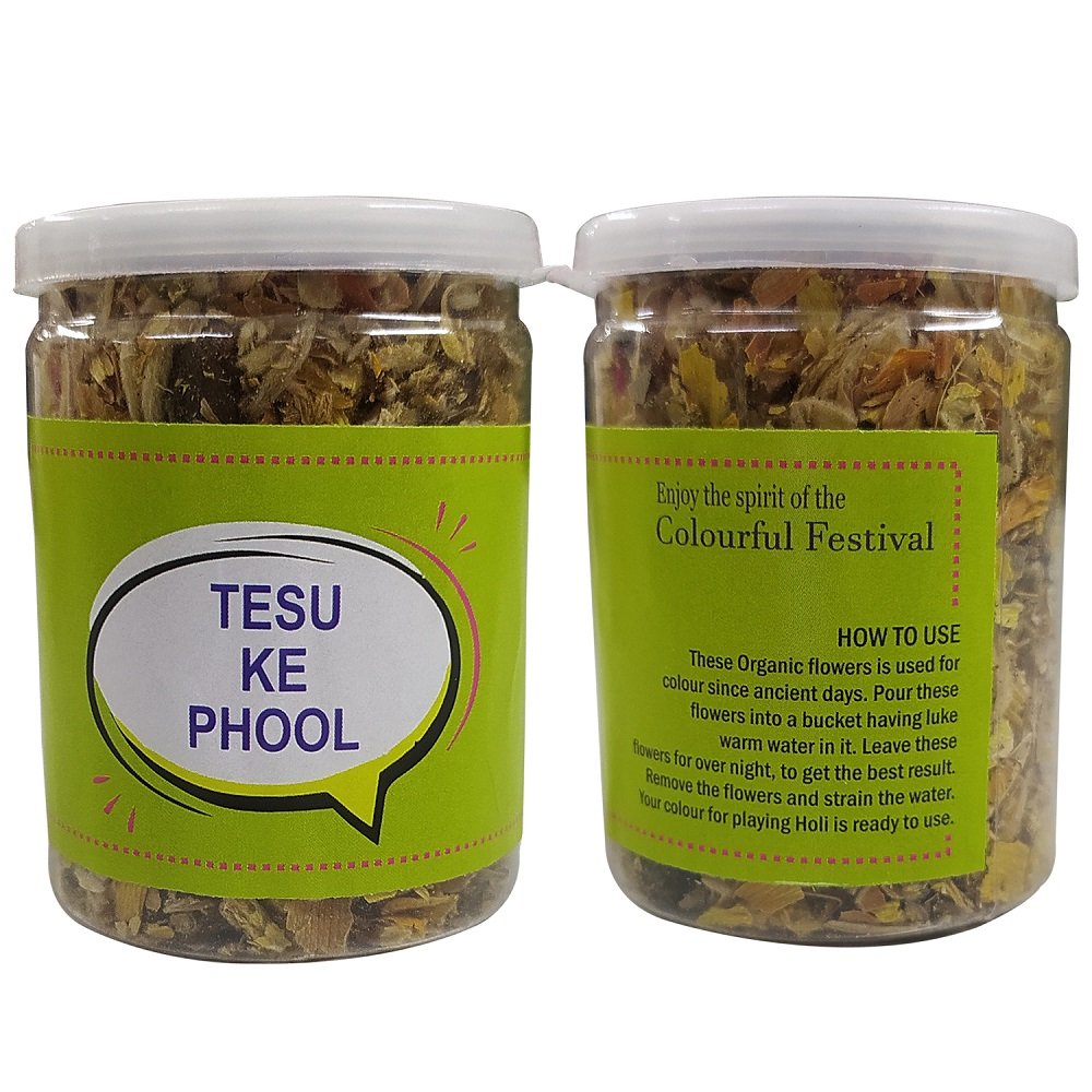 Tesu Ke Phool: Organic flowers traditionally used for color since ancient times. Preparation instructions: Pour these flowers into lukewarm water in a bucket, leave them overnight for the best results. After soaking, remove the flowers and strain the water – your Holi color is ready to use. Incorporates ancient traditions for a natural and authentic Holi experience.