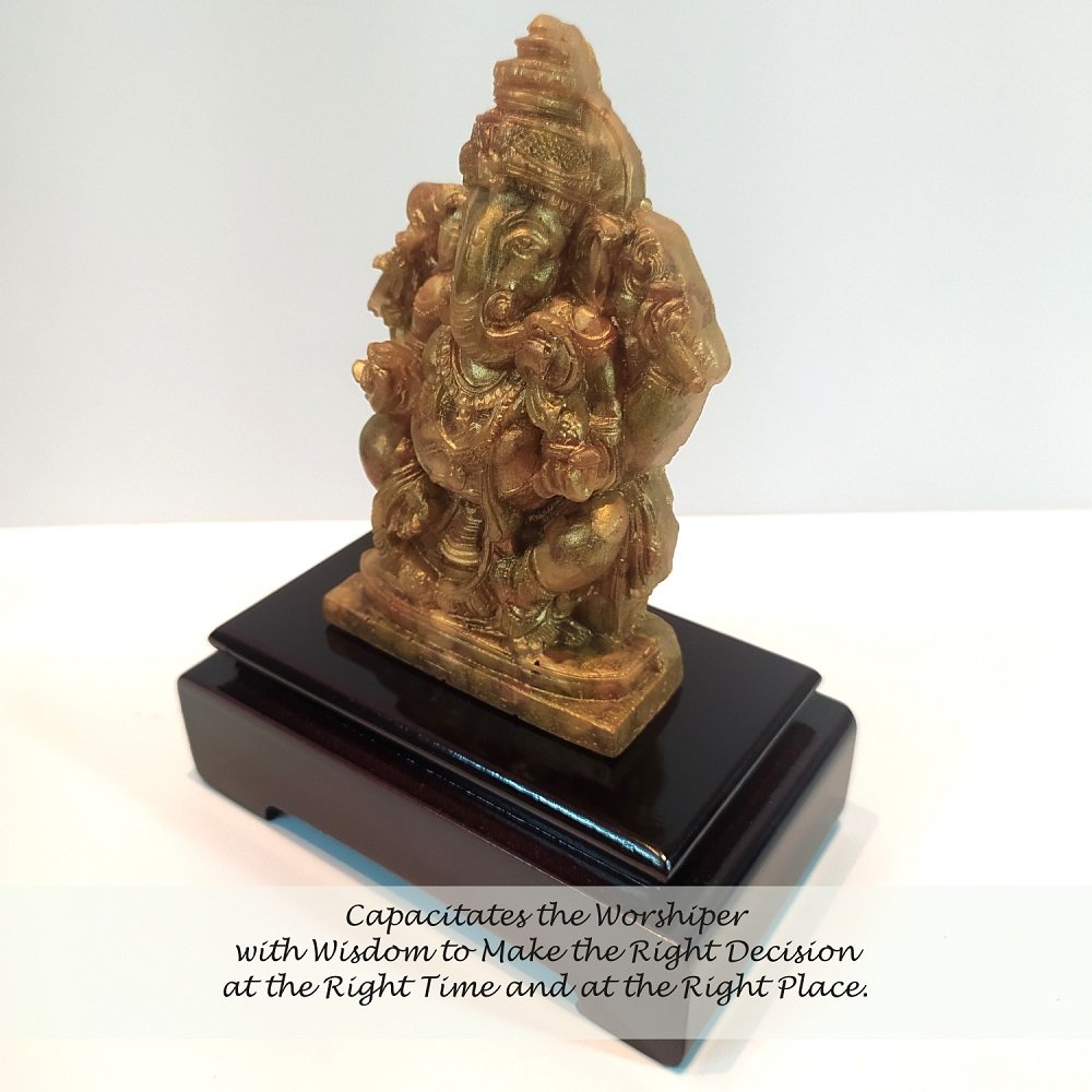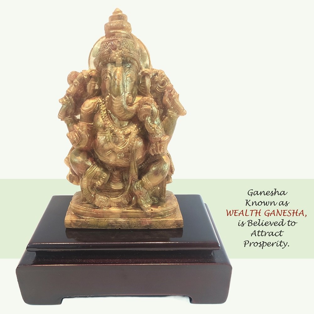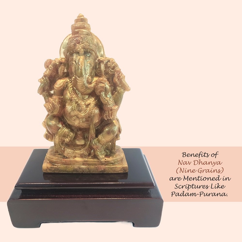 Navdhanya Ganesha Idol with Wooden Base Murti Golden for Home and Office Decor