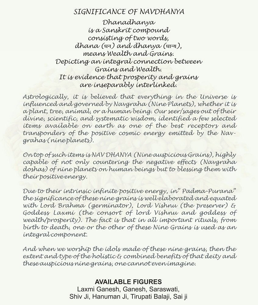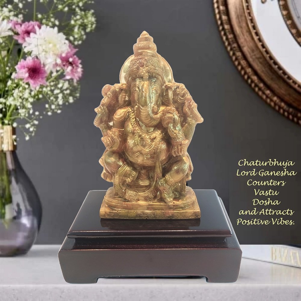 Elevate your spiritual space with our Chaturbhuj Lord Ganesha Idol, meticulously crafted from Nav-Dhanya (Nine Auspicious Grains), making it not only unique but spiritually significant. Coated in a water-proof metallic golden color and placed on a wooden base, this idol boasts exquisite craftsmanship. According to ancient Indian texts like Padma-Purana, Nav-Dhanya holds profound astrological and positive energy benefits, countering the negative effects of Navagrahas (Nine Planets). The term ‘Dhandhanya,’ linking prosperity and grains, symbolizes wealth and abundance. Ideal for rituals and pujas, these grains have been an essential part of Indian traditions, from birth ceremonies to death rites. Vastu experts recommend placing this idol in the Northeast or Eastern corner of your home or office, enhancing positive energy and removing Vaastu defects. This mesmerizing idol features impeccable details such as eyes, nose, jewelry, and Mushak (Lord Ganesha’s vehicle), making it a divine decoration for your living space or a thoughtful devotional gift for your loved ones. Embrace prosperity, happiness, and peace with this perfect addition to your home or office temple.
