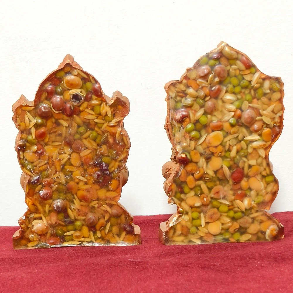 Experience the divine presence of Goddess Lakshmi and Lord Ganesha with these exquisite statues crafted from Nav Dhanya, also known as Nine Grains. These statues are meticulously painted with a waterproof metallic copper color to enhance their appearance and expressions. Ideal for adorning your home or office temple and perfect for Deepawali/Diwali pooja, they hold a special place in daily worship. Crafted from auspicious grains, these statues are believed to ward off Navagraha Doshas, remove obstacles, and bestow abundance. Rooted in ancient scriptures like the Padampurana, these grains are equated with Lord Brahma, Vishnu, and Goddess Lakshmi, symbolizing their immense significance. With a legacy of auspiciousness, these grains are an integral part of daily Poojan and various rituals, serving as a conduit for cosmic energy and harmonizing the energies of Navagrahas. Embrace these statues to invite health, wealth, peace, and prosperity into your life, enriching every special occasion and ritual with their profound symbolism.
