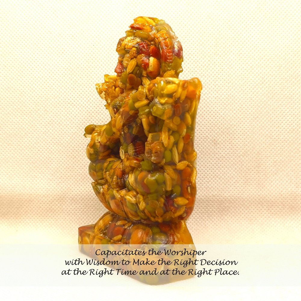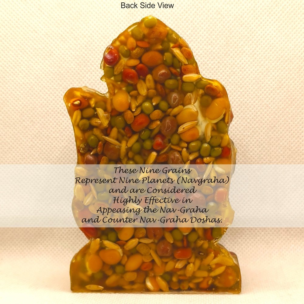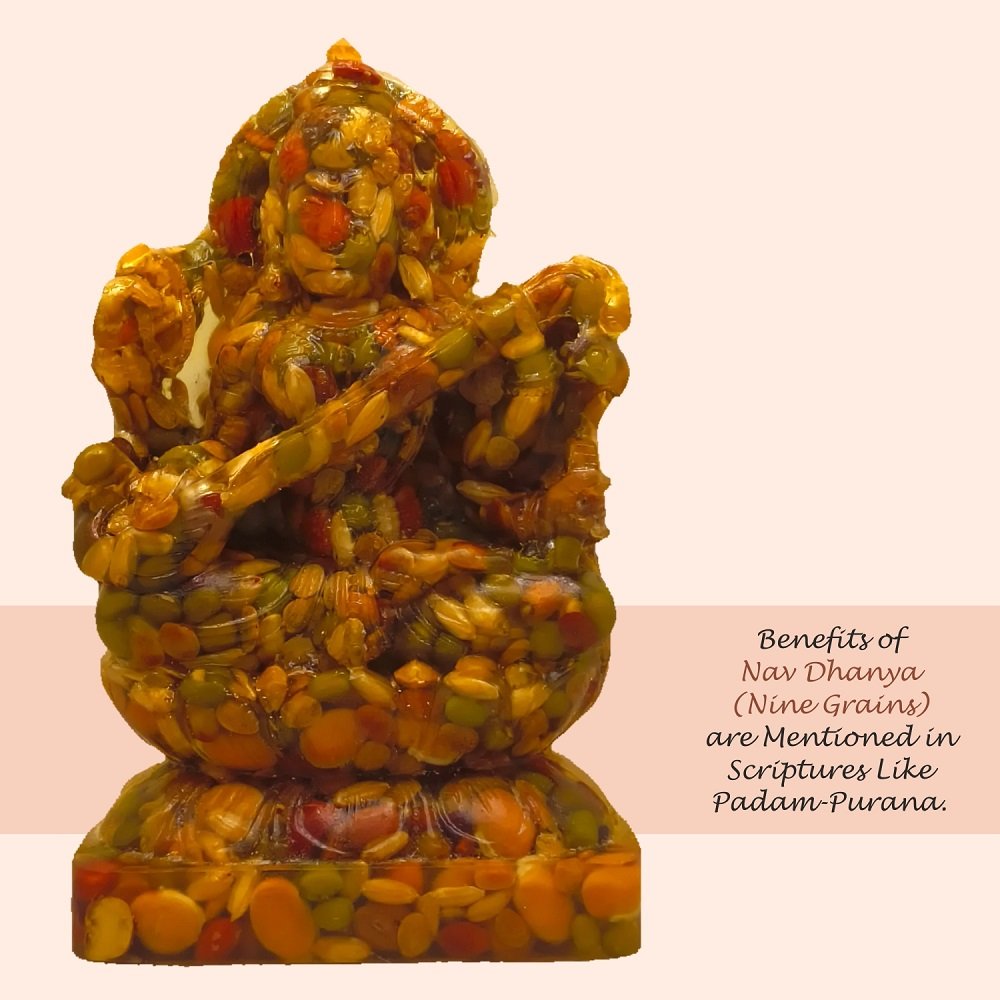 These first-of-its-kind NAV-DHANYA Idols are made of NINE AUSPICIOUS GRAINS. IMPORTANCE AND SIGNIFICANCE OF NAV DHANYA IDOLS: The etymology of the word “Dhanya” itself reveals it’s importance. “Dhanya” means properity. The significance of Nav-Dhanya (Nine Auspiciou Grains) for their spiritual, astrological, materialistic/wordly and positive energy related benefits are very well mentioned in many ancient Indian scriptures like Padampurana etc. Astrologically, It is beleieved that every thing in the Universe is influenced and goverened by Navgraha (Nine Planets), whether it is a plant, tree, animal or a human being. Our seer/sages (Rishi/Muni) who were blessed with the divine vision, could see, identify and systematically analyse the integral relationship and impact of cosmicenergy in general & of nine planets in particular on Human beings. As thery were devoteed for the overall well being of the human being, out of their divine, scientific and systematic wisdom, they identified few selected items avilable on earth as one of the best receptors and transponders of the positive cosmic energy emitted by the Nav-grahas (nine planets). In this regard they ranked on top the NINE AUSPICIOUS GRAINS,highly capable to not only countering the negative effects/navgraha doshas of nine planets on human being but to bless them with their positive energy also. Their wisdom full use definitely bless one’s life with both spiritual ecstacy and worldly success. Since time immemorial,due to their well proven auspiciousness, these nine grains are consisdered an inevitable component of almost all Karm-Kandas (rituals related to god/goddess’s and nav-graha to remove the obstacles and bless one’s life with health, wealth, peace & prosperity) and daily worship. In all rituals, whether retalted to birth, marriage, buisness/work or any other aspect of human life, of almost all cultures and civiliazations one or the other of these nine grains are used as an integral component.