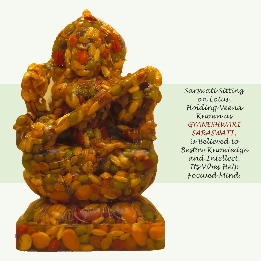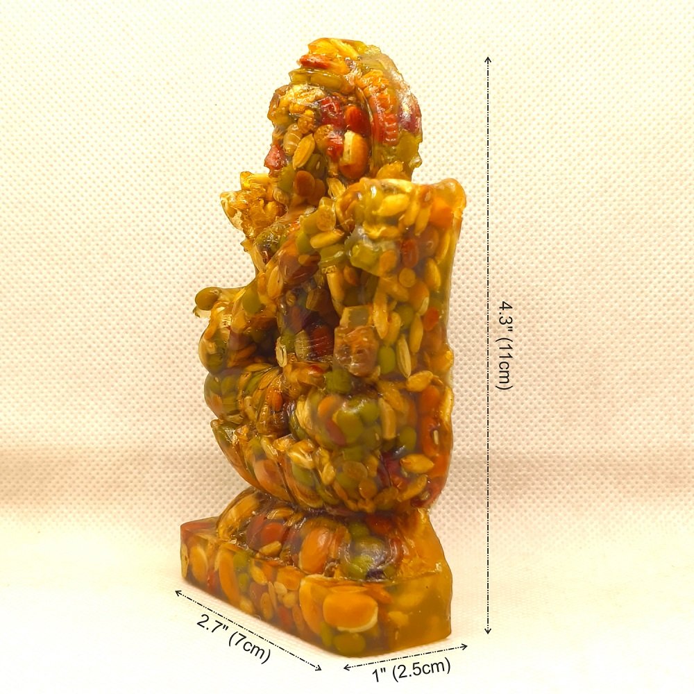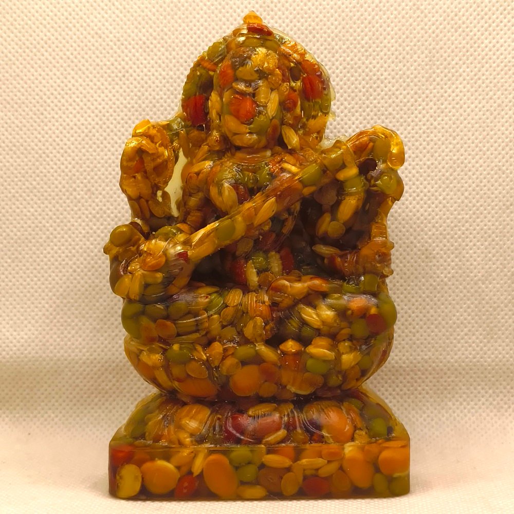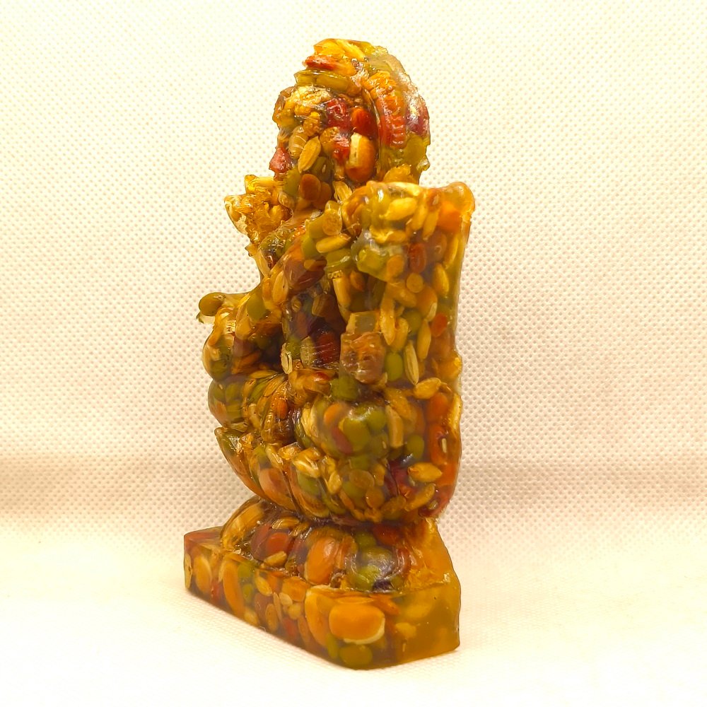 These first-of-its-kind NAV-DHANYA Idols are made of NINE AUSPICIOUS GRAINS. IMPORTANCE AND SIGNIFICANCE OF NAV DHANYA IDOLS: The etymology of the word “Dhanya” itself reveals it’s importance. “Dhanya” means properity. The significance of Nav-Dhanya (Nine Auspiciou Grains) for their spiritual, astrological, materialistic/wordly and positive energy related benefits are very well mentioned in many ancient Indian scriptures like Padampurana etc. Astrologically, It is beleieved that every thing in the Universe is influenced and goverened by Navgraha (Nine Planets), whether it is a plant, tree, animal or a human being. Our seer/sages (Rishi/Muni) who were blessed with the divine vision, could see, identify and systematically analyse the integral relationship and impact of cosmicenergy in general & of nine planets in particular on Human beings. As thery were devoteed for the overall well being of the human being, out of their divine, scientific and systematic wisdom, they identified few selected items avilable on earth as one of the best receptors and transponders of the positive cosmic energy emitted by the Nav-grahas (nine planets). In this regard they ranked on top the NINE AUSPICIOUS GRAINS,highly capable to not only countering the negative effects/navgraha doshas of nine planets on human being but to bless them with their positive energy also. Their wisdom full use definitely bless one’s life with both spiritual ecstacy and worldly success. Since time immemorial,due to their well proven auspiciousness, these nine grains are consisdered an inevitable component of almost all Karm-Kandas (rituals related to god/goddess’s and nav-graha to remove the obstacles and bless one’s life with health, wealth, peace & prosperity) and daily worship. In all rituals, whether retalted to birth, marriage, buisness/work or any other aspect of human life, of almost all cultures and civiliazations one or the other of these nine grains are used as an integral component.