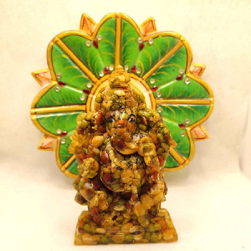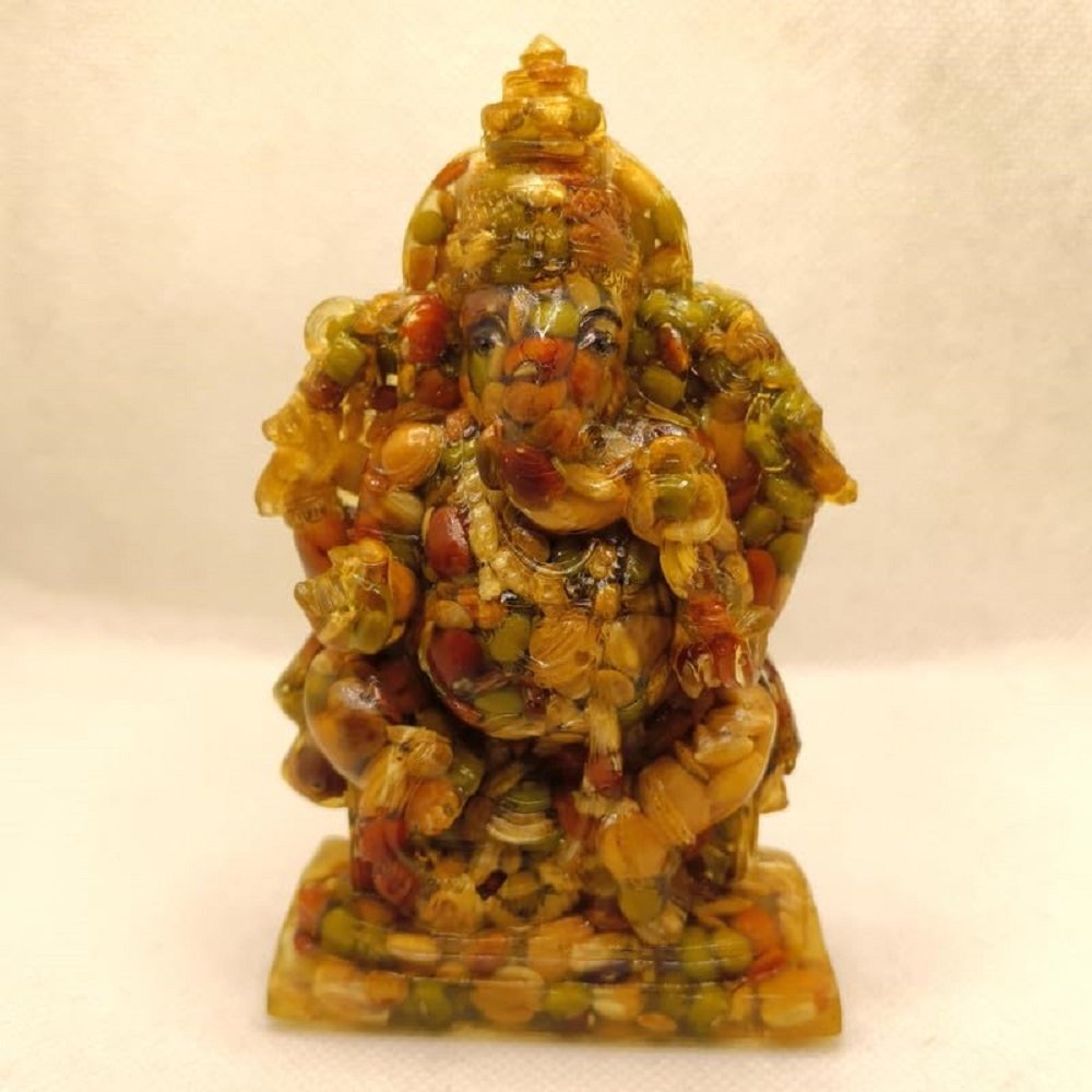 - This Chaturbhuj Lord Ganesha Idol Is Made of Nav-Dhanya (Nine Auspicious Grains), Making It a Unique Lord Ganesha Idol in Terms of Its Material and Importance. To Make Its Appearance and expressions more attractive, it has been painted with a waterproof, metallic copper colour.