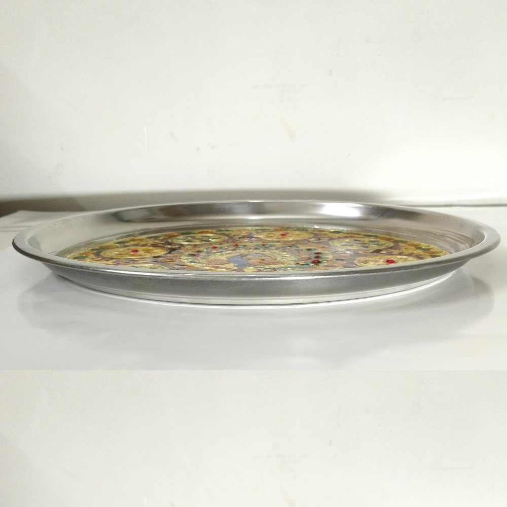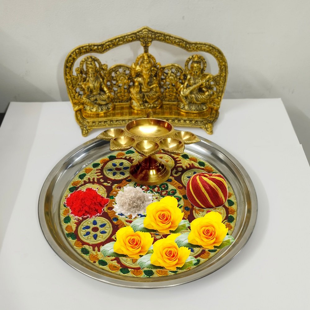 Navratri Pooja Thali Stainless Steel for Mandir Meenakari Aarti Thali (Diameter-23 cm)