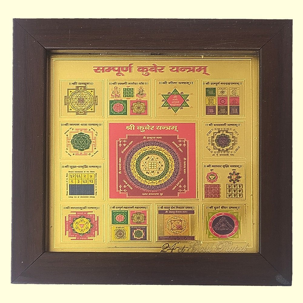 Goddess Lakshmi attracts wealth, and Lord Kuber manages and controls the entire wealth of the universe. it. It is believed that worshiping Lord Kuber and his yantra may open up new opportunities and sources of income and increase the flow of money. This yantra is a combination of 13 yantras, which makes it a sampoorna yantra. Kuber Yantra in the center Shree Yantram (Starting from the top left corner and moving in a clockwise direction) Followed by Shree Laxmi Ganesh Yantra Geeta Yantram Sampoorna Navgrah Yantram Shree Saraswati Yantram Shree Vyapar Vrisshi Yantram Shree Durga Bisa Yantram Vaastu Dosh Nivaran Yantra Sampoorna Mahalakshmi Yantram Shree Baglamukhi Yantram Shree Sukh Samriddhi Yantram Shree Kanakdhara Yantram The actual product delivered to you would be similar to the one shown in the pictures above. There might be slight differences in the color (majorly due to monitor settings) and dimensions. If you have any questions about a particular color or shade, please contact us before ordering for clarification.