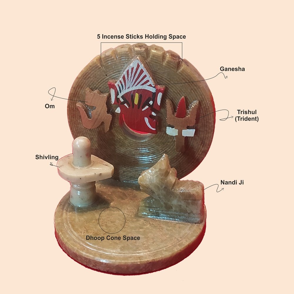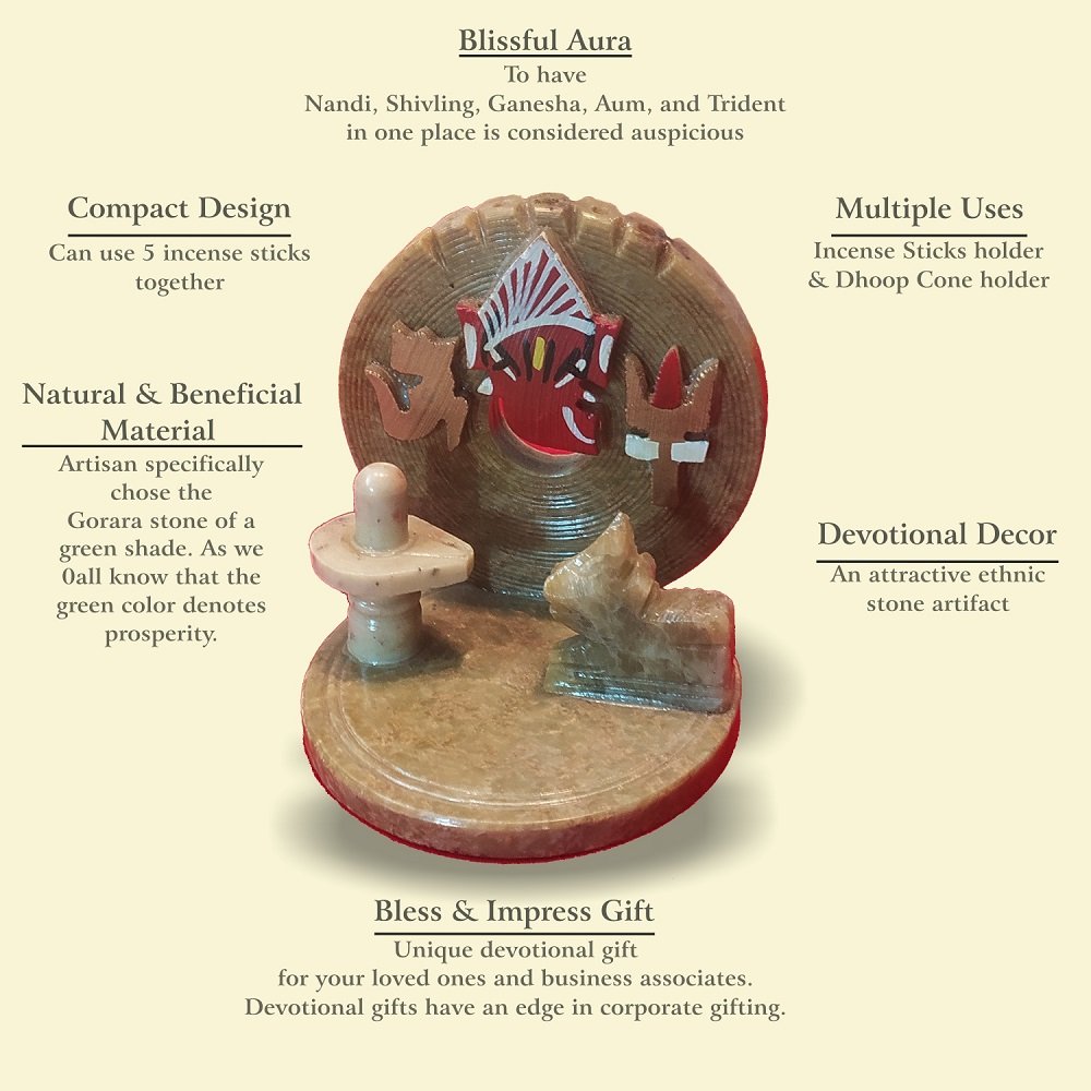 It is unique and a compact incense stick & Dhoop Cone holder, adorned with Nandi ji, Shivling, Aum, Ganesha, and Trident (Trishul), all of which have their own positive and specific devotional significance.