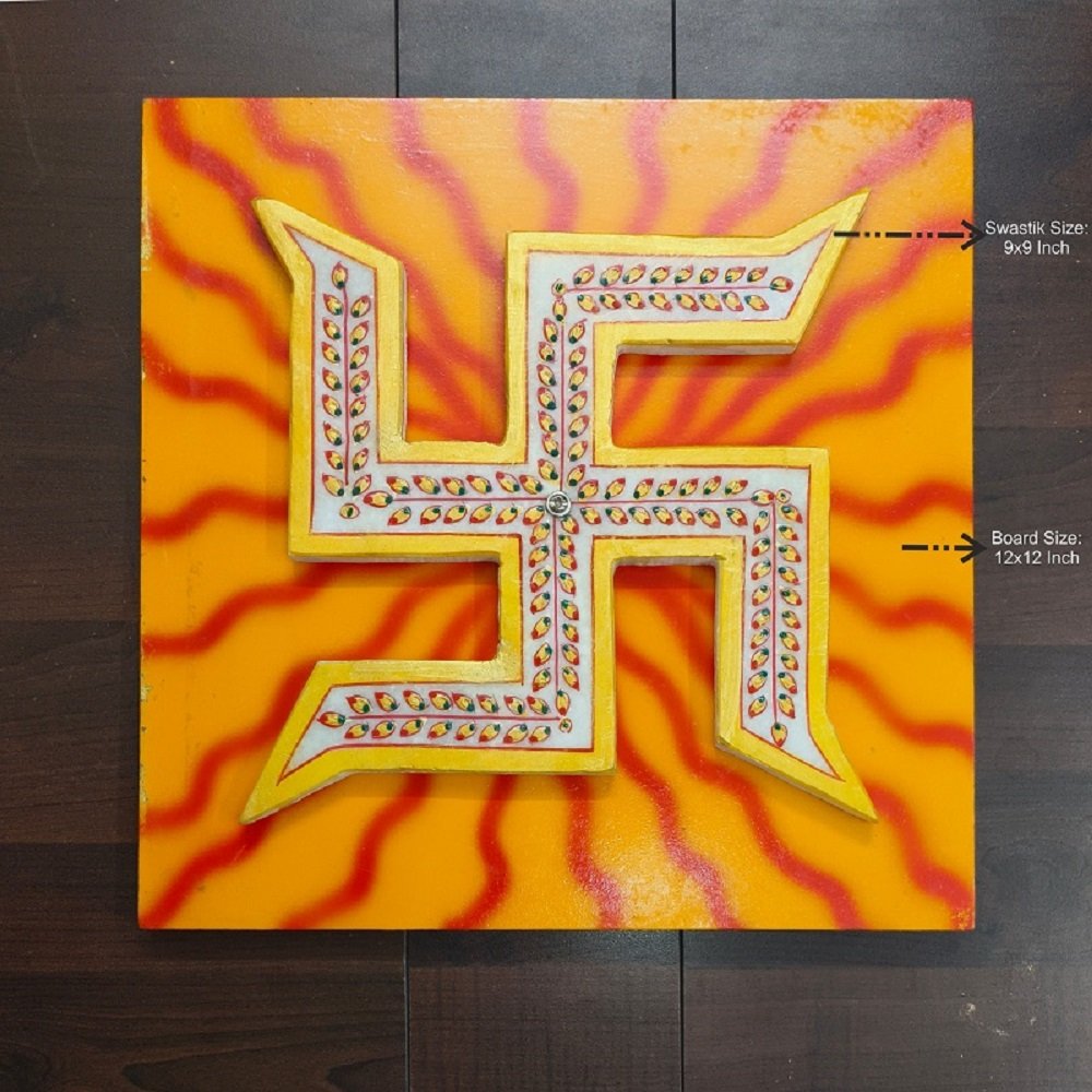 Introducing the Dharohar The Heritage Marble Swastik, a stunning 9-inch symbol of prosperity and positive energy. Crafted from a single piece of marble, this unique Swastik is mounted on a wooden board and adorned with a world-famous floral pattern in auspicious colours – Red, Green, and gold, symbolising strength, growth, and prosperity. This ancient symbol holds deep spiritual significance, representing good fortune and well-being, countering negative energies according to Vaastushastra. Scientifically, it emits positive energy measured at 4,00,000 Bovis, making it a powerful geomantic tool. In Hindu tradition, the Swastika is associated with Lord Ganesha and signifies the sun’s life-giving rays, bringing stability and strength in all directions. Ideal for placement on entrance doors, eastern walls, or near your home/office temple, this Swastik invites positivity and happiness. It also serves as a thoughtful devotional gift, perfect for housewarmings, new business openings, Diwali, and other special occasions. Embrace the rich heritage and spiritual significance with this exquisite Swastik for your home or workplace.
