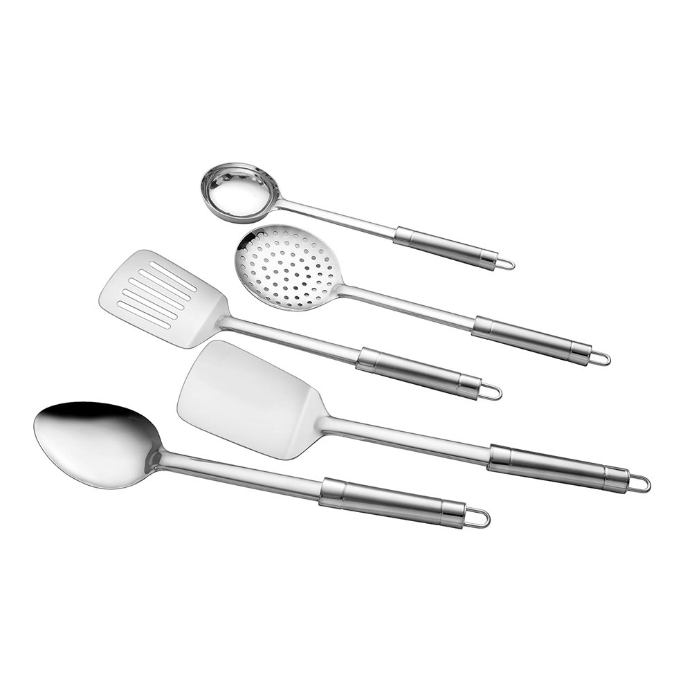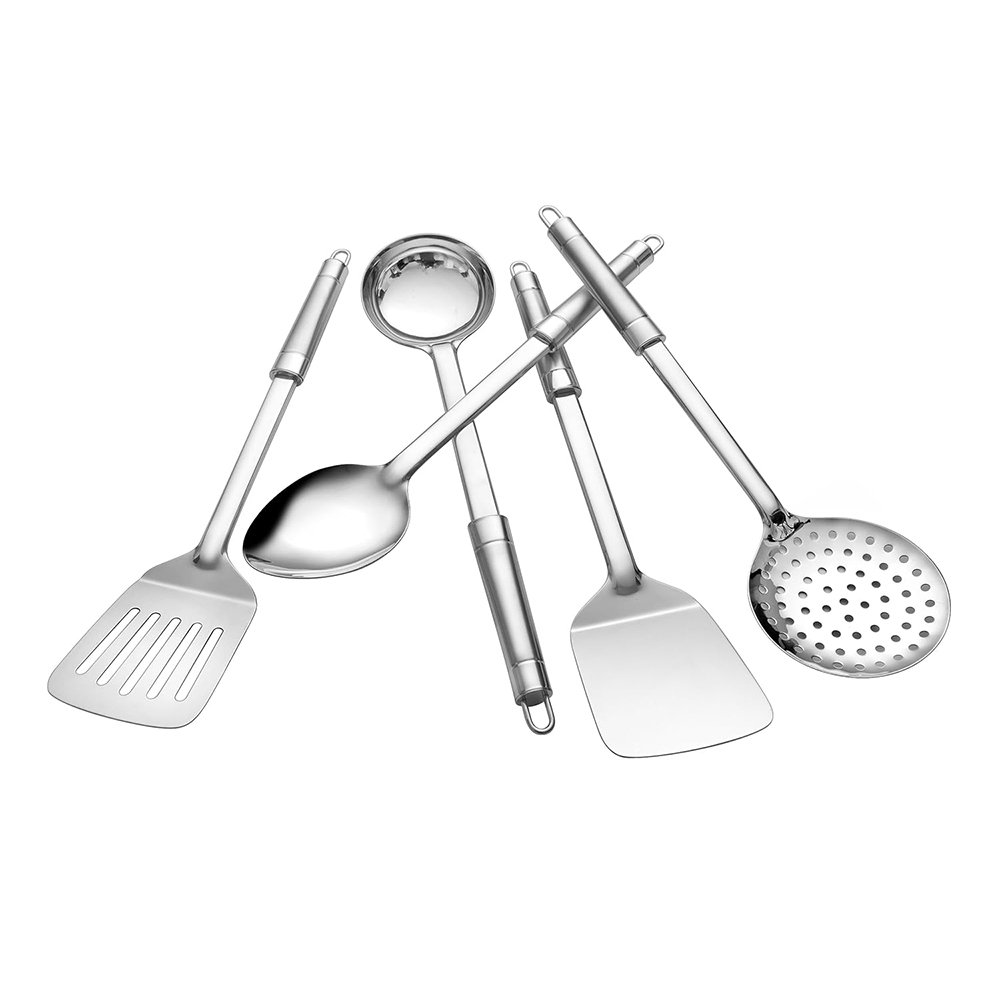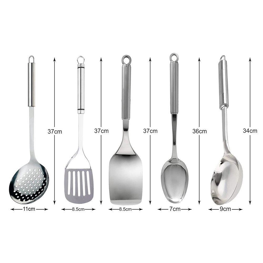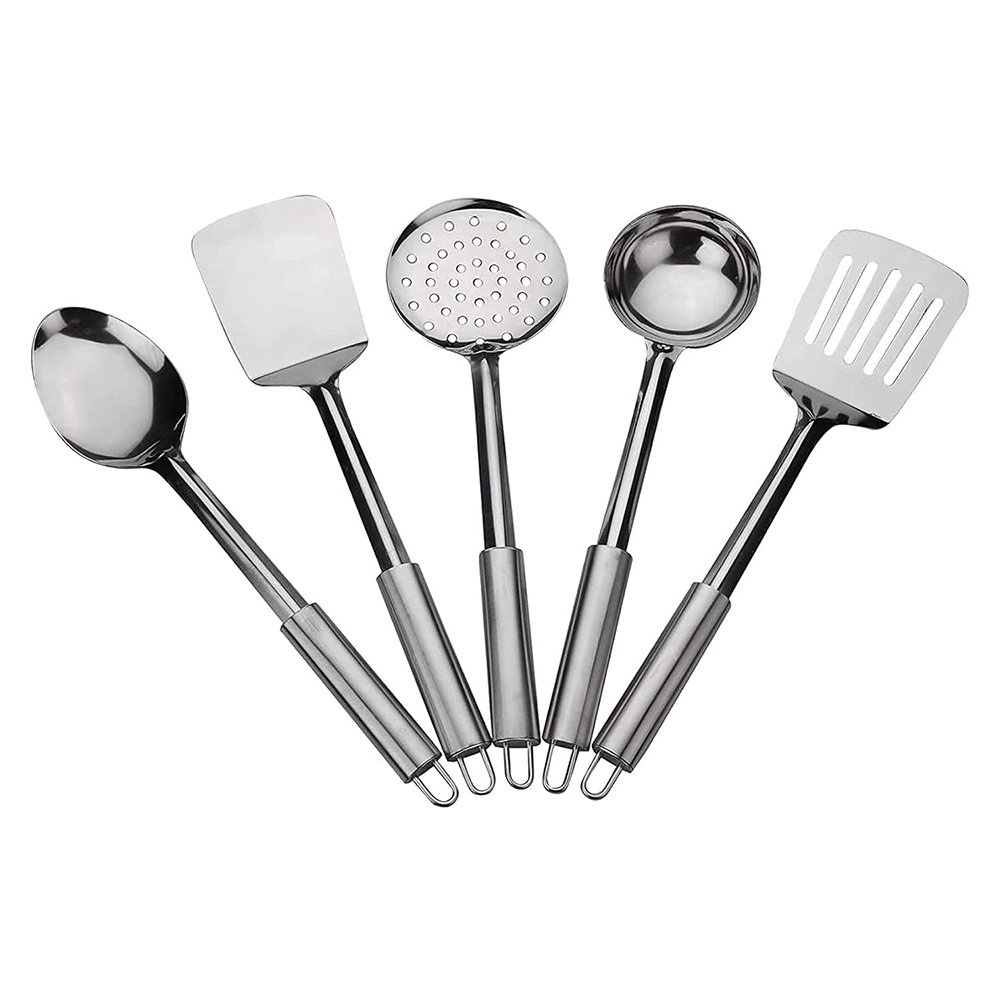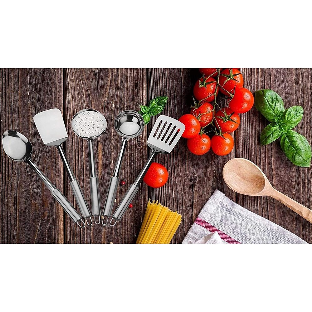 Tainless Steel Kitchen Tool Set for Cooking Silver (Contains: 1 Ladle, 1 Skimmer,1 Turner, 1 Spatula, 1 Slotted Turner) Set of 5