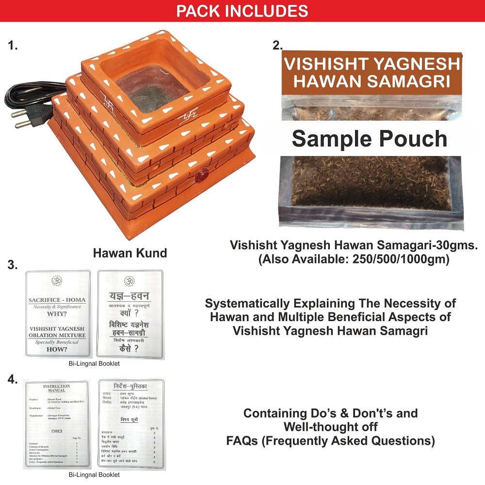 PACK INCLUDES: Havan kund+ Sample pouch of Vishisht Yagnesh Havan Samagri + 32 pages of a bi-lingual booklet explaining the astrological, worldly, spiritual & medicinal benefits + 16 pages bi-lingual instructional manual containing FAQs(Frequently Asked Questions)